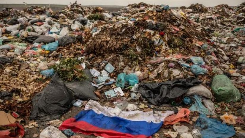 ხერსონის პირას მდებარე ნაგავსაყრელზე აღმოჩენილია რუსული დროშები, სამხედრო უნიფორმები და ჩაფხუტები.