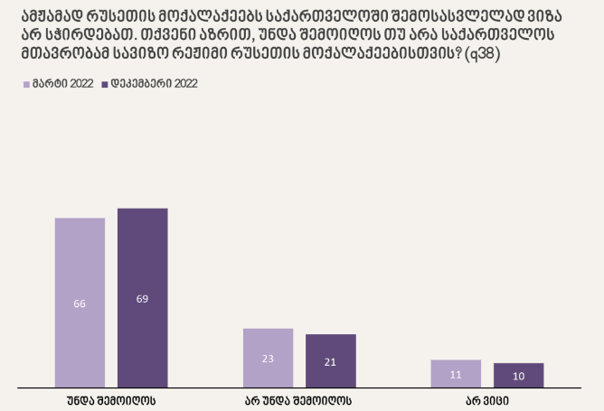 NDI-ის კვლევის მიხედვით, აღნიშნულ კითხვას დადებითად 69%-მა უპასუხა, 21% თქვა, რომ სავიზრო რეჟიმი არ უნდა შემოვიღოთ, ხოლო 10%-მა თქვა, რომ არ იცის.