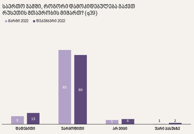 NDI-ის კვლევაში ჩანს, რომ საქართველოს მოქალაქეებს რუსეთის მთავრობის მიმართ ცალსახად უარყოფითი დამოკიდებულება აქვთ: