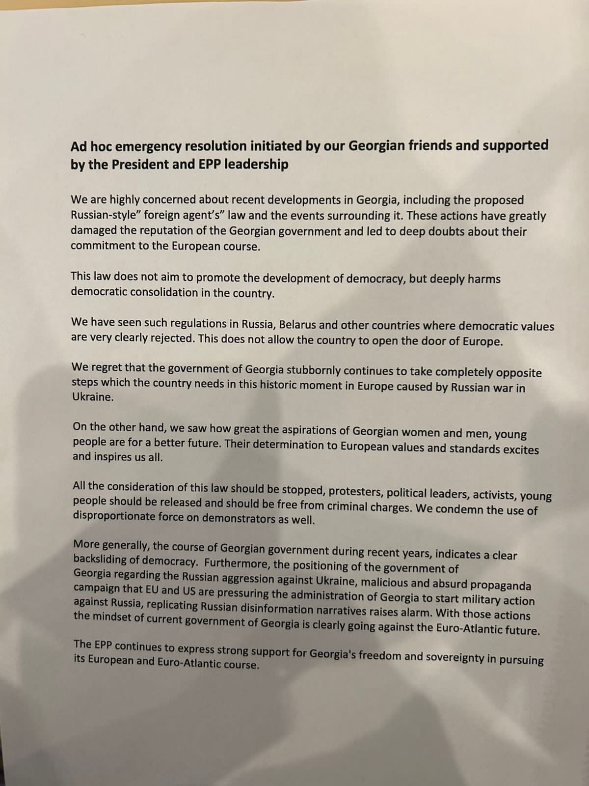 რეზოლუციაში ნათქვამია, რომ EPP აგრძელებს მტკიცე მხარდაჭერის გამოხატვას საქართველოს თავისუფლებისა და სუვერენიტეტის მიმართ მისი ევროპული და ევროატლანტიკური კურსის გატარებაში.