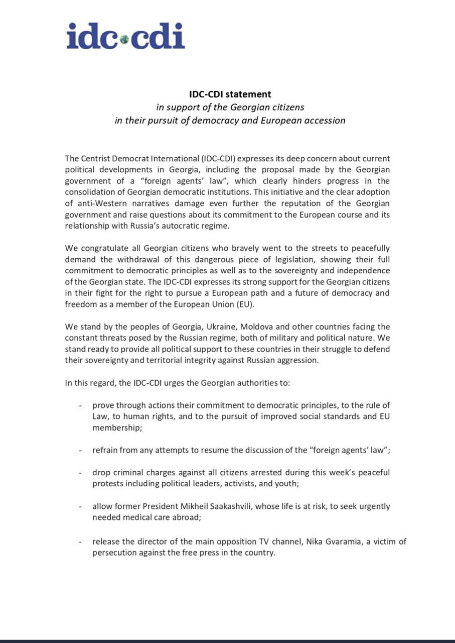 ქრისტიან-დემოკრატიული პარტიების საერთაშორისო გაერთიანება, ცენტრისტ დემოკრატ ინტერნაციონალი (IDC-CDI) საქართველოში მიმდინარე მოვლენებზე, ასევე, "მთავარი არხის" გენერალური დირექტორის, ნიკა გვარამიას პატიმრობაზე შეშფოთებას გამოხატავს.