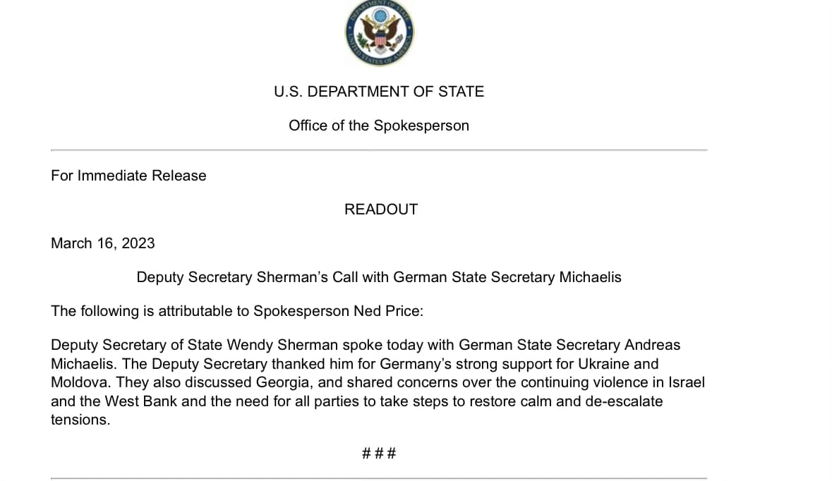 აშშ-ის სახელმწიფო მდივნის მოადგილე, ვენდი შერმანი, გერმანიის სახელმწიფო მდივანს, ანდრეას მიქაელს ესაუბრა. შეხვედრაზე საუბარი შეეხო საქართველოსაც. როგორც სახელმწიფო დეპარტამენტის პრესსპიკერის, ნედ პრაისის მიერ გავრცელებულ გაცხადებაში ვკითხულობთ: "შერმანმა მადლობა გადაუხადა ანდრეას მიქაელს გერმანიის მტკიცე მხარდაჭერისთვის უკრაინისა და მოლდოვას მიმართ.