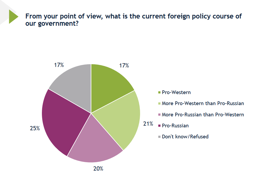 იგივე კითხვაზე გამოკითხულთა 17% ამბობს, რომ მთავრობის პოლიტიკა პროდასავლურია, 20% ამბობს, რომ უფრო პრორუსული, ვიდრე პროდასავლური, 21% კი ამბობს, რომ უფრო პროდასავლური, ვიდრე პრორუსული. 17% უარს ამბობს პასუხზე.
