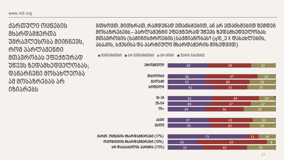 ამავე კვლევით, ქართული ოცნების მხარდამჭერთა უმრავლესობა მიიჩნევს, რომ პარლამენტი მთავრობას ეფექტურად უწევს ზედამხედველობას; დანარჩენი მოსახლეობა ამ მოსაზრებას არ იზიარებს.