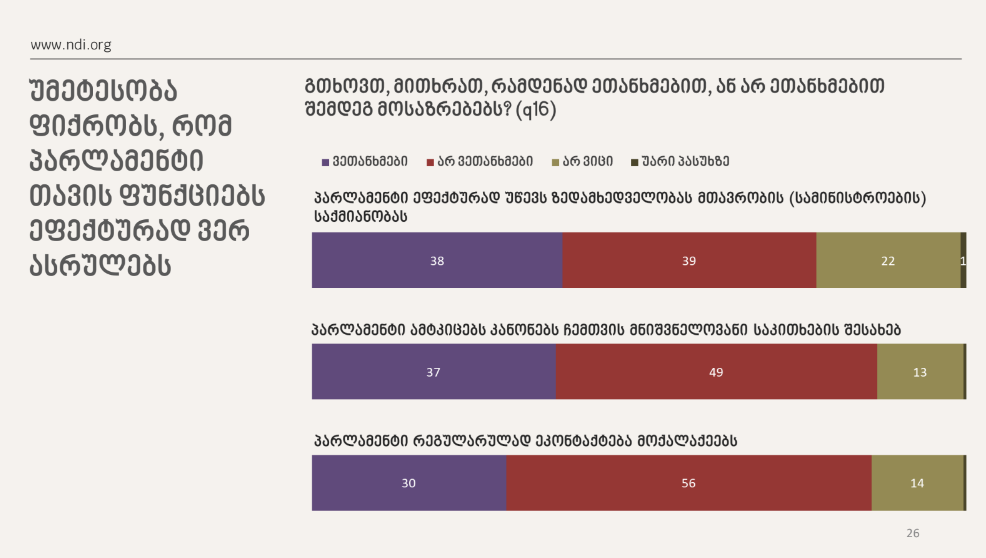 NDI-ს კვლევით, გამოკითხულთა უმეტესობა ფიქრობს, რომ პარლამენტი თავის ფუნქციებს ეფექტურად ვერ ასრულებს. კითხვაზე - გთხოვთ მითხრათ, რამდენად ეთანხმებით, ან არ ეთანხმებით შემდეგ მოსაზრებებს?