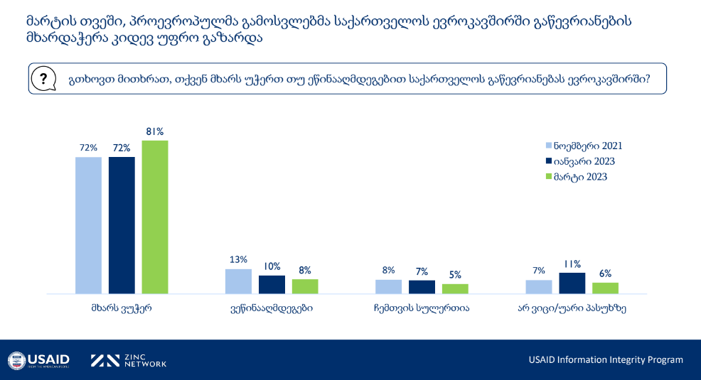 81% - მხარს ვუჭერ; (2021 ნოემბერში და 2023 წლის აინვარში პასუხი 72% იყო)