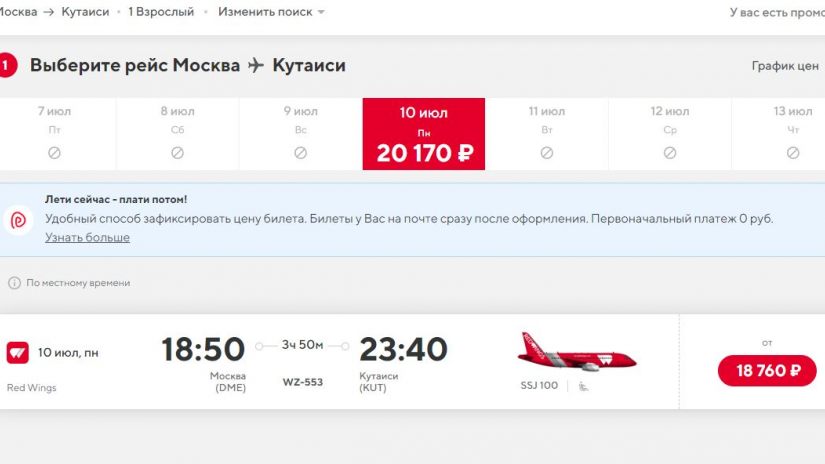 რუსული ავიაკომპანია Red Wings-ი საქართველოს მიმართულებით ფრენებს იწყებს. კომპანიის ვებ-გვერდის თანახმად, პირველი რეისი მოსკოვსა და ქუთაისს შორის 10 ივლისს შესრულდება. ბილეთის ღირებულება 237 დოლარია.