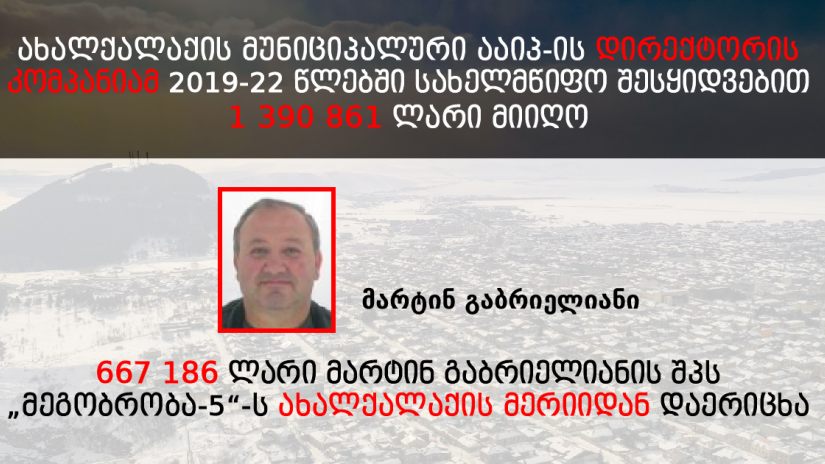 ახალქალაქის მუნიციპალური ააიპ-ის დირექტორის, მარტინ გაბრიელიანის კომპანიამ 2019-2022 წლებში სახელმწიფო შესყიდვებით 1,390,861 ლარი მიიღო, - ამის შესახებ ინფორმაციას არასამთავრობო ორგანიზაცია "საერთაშორისო გამჭვირვალობა" ავრცელებს.