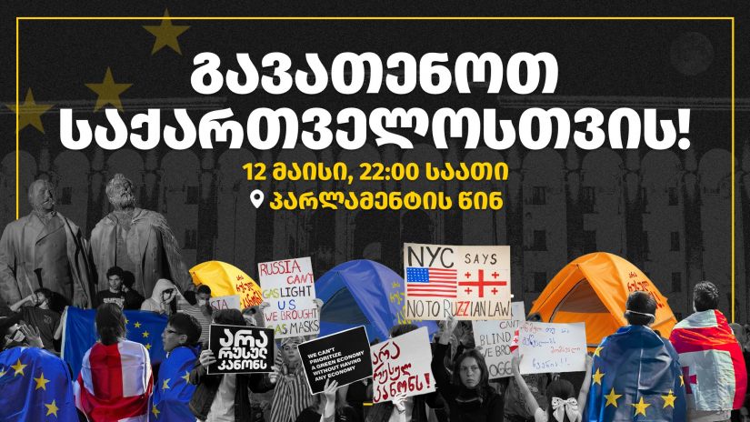 "გავათენოთ ღამე ერთად და დილით, არ მივცეთ საშუალება ოცნების დეპუტატებს, აუღელვებლად შევიდნენ პარლამენტში", - პარლამენტის წინ, 12 მაისს 22:00 საათზე რუსული კანონის საწინააღმდეგო ღამისთევა