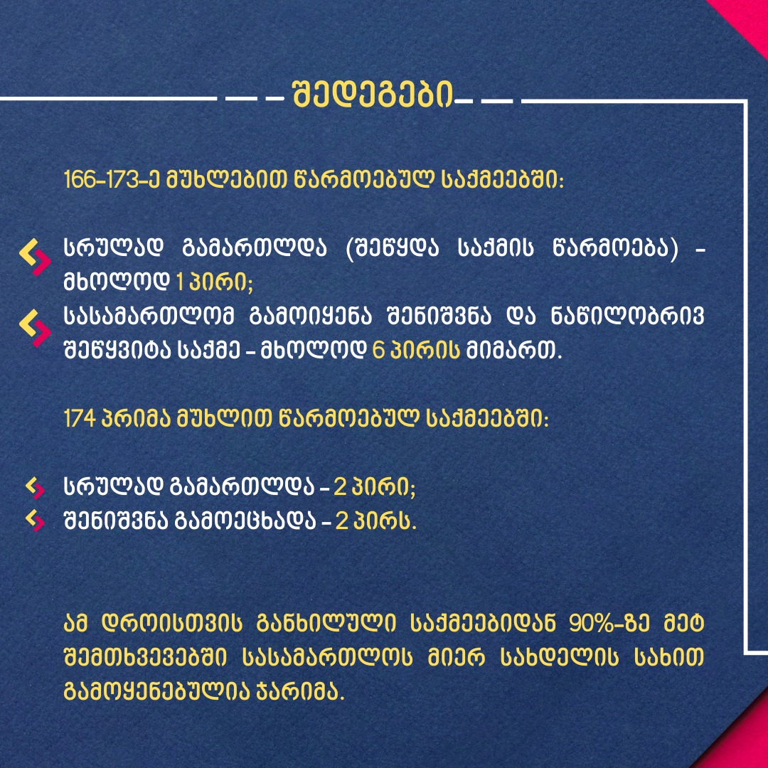 პირველი ინსტანციის სასამართლოში დასრულებული საქმეების ფარგლებში ჯარიმების საერთო რაოდენობა უკვე აღემატება 150 000 ლარს. განცხადებაში აღნიშნულია, რომ ამ დროისთვის განხილული საქმეებიდან 90%-ზე მეტ შემთხვევაში სასამართლოს მიერ სახდელის სახით გამოყენებულია ჯარიმა.