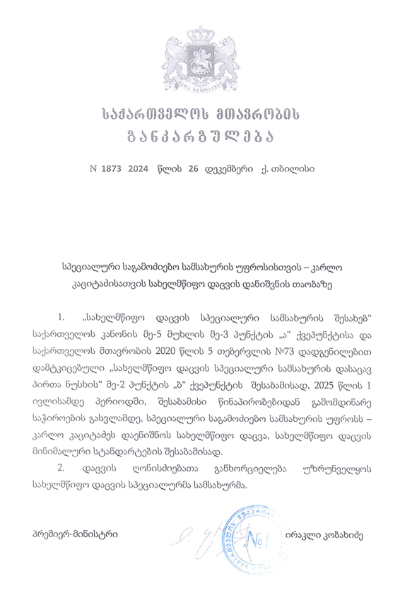 განკარგულება 26 დეკემბრით თარიღდება. „დაცვის ღონისძიებათა განხორციელებას სახელმწიფო დაცვის სპეციალური სამსახური“ უზრუნველყოფს.