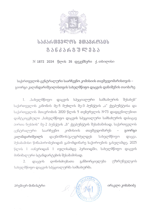 ცესკო-ს თავმჯდომარისთვის სახელმწიფო დაცვის დანიშვნის თაობაზე დადგენილებაში აღნიშნულია, რომ კალანდარიშვილს სახელმწიფო დაცვა „გაუგრძელდეს-დაენიშნოს შესაბამისი წინაპირობებიდან გამომდინარე საჭიროების გასვლამდე, 2025 წლის პირველი იანვრიდან, პირველ ივლისამდე პერიოდში, სახელმწიფო დაცვის მინიმალური სტანდარტების შესაბამისად“.