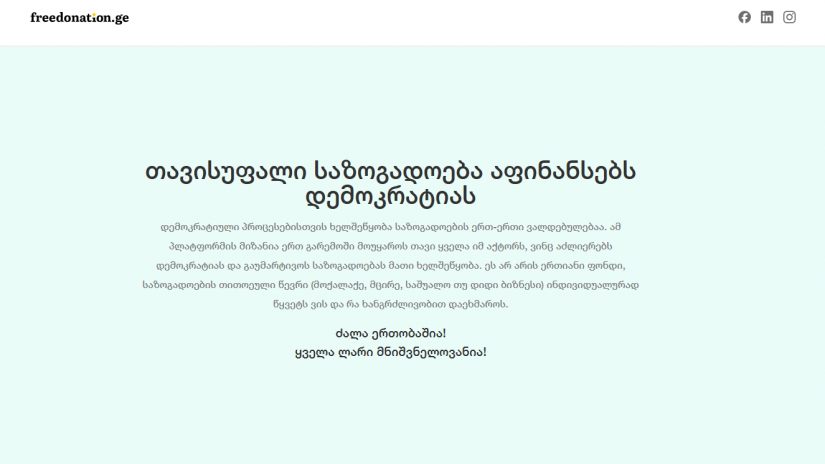 "დემოკრატიისთვის ბრძოლა და ამისთვის გარკვეული ფინანსების გაღებაც არის საზოგადოების ვალდებულება. 200 000-მდე ადამიანი თუ იღებს აქტიურად საპროტესტო გამოსვლებში, თითოეულმა თვეში 20 ლარიც რომ გაიღოს, ეს არის 4 მლნ ლარი, რომელსაც ძალიან ბევრი კეთილი საქმის გაკეთება შეუძლია - ბევრისთვის ჯარიმის გადახდა, მკურნალობა თუ სხვა“, - განაცხადა გიორგი ჩუგოშვილმა და დასძინა, რომ Freedonation.ge არ არის ფონდი, ეს არის პლატფორმა, რომელიც დემოკრატიაზე მომუშავე ორგანიზაციებს, ხალხს და საზოგადოებას აკავშირებს ერთმანეთთან.