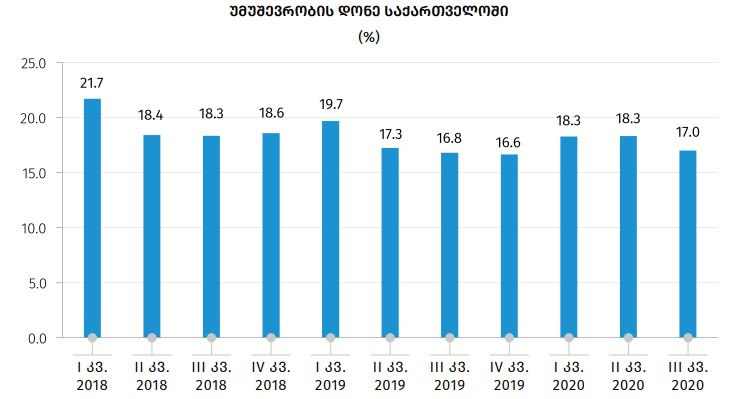 ასევე, საქსტატის მონაცემებით, 2020 წლის მესამე კვარტალში, წინა წლის შესაბამის პერიოდთან შედარებით, 17%-მდე გაიზარდა ქვეყანაში უმუშევრობის დონე.