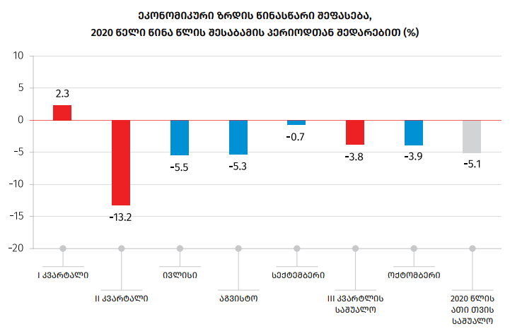 ამიტომ, გასაკვირი არ არის, რომ 2020 წლის ბოლოსთვის, ოქტომბერში, წინა წლის შესაბამის პერიოდთან შედარებით, საქართველოში რეალური მთლიანი შიდა პროდუქტის (მშპ) კლებამ 3.9 პროცენტი შეადგინა, ხოლო 2020 წლის პირველი ათი თვის საშუალო მაჩვენებელი -5.1%-მდე დავიდა.