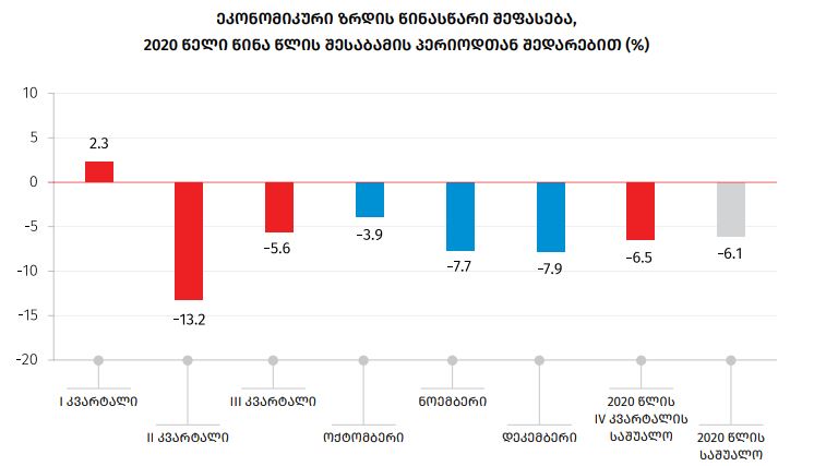 საქსტატის წინასწარი შეფასებით, 2020 წლის დეკემბერში, წინა წლის შესაბამის პერიოდთან შედარებით, მთლიანი შიდა პროდუქტის კლებამ 7.9% შეადგინა.