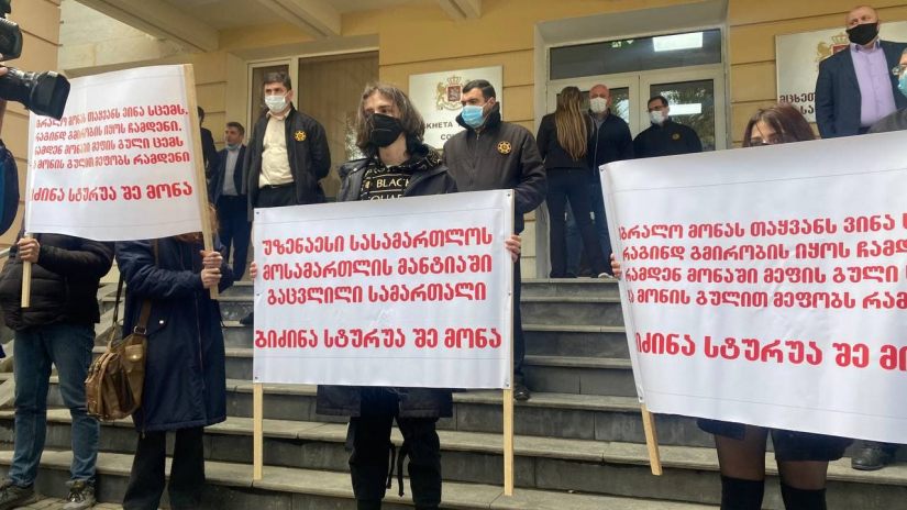 მცხეთის სასამართლოსთან, სადაც გიორგი შაქარაშვილის საქმეზე მოსამართლემ გადაწყვეტილება უნდა გამოაცხადოს, პროცესი პროტესტის ფონზე დაიწყება. სასმართლოს შენობასთან ბრალდებულების ახლობლებს პლაკატები აქვთ გაშლილი. პროტესტის ნიშნად, პროცესზე შესვლას არ გეგმავენ ადვოკატები.