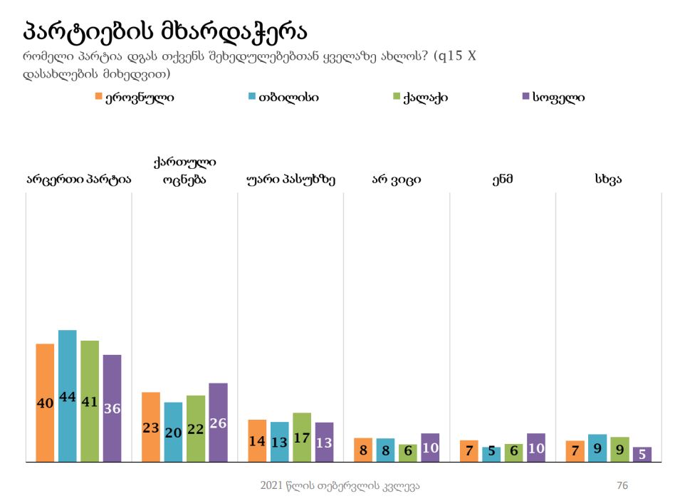 NDI-ს კვლევით, კითხვაზე, რომელი პარტია დგას თქვენ შეხედულებებთან ყველაზე ახლოს, პასუხები ასე გადანაწილდა: