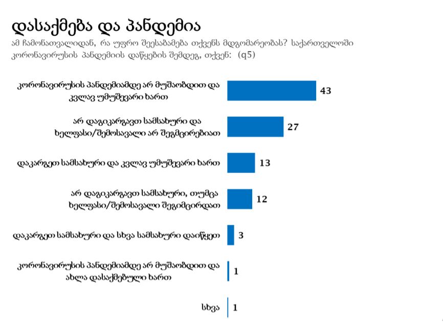 NDI-ის ახალი კვლევის მიხედვით, გამოკითხულთა 13%-მა პანდემიის დაწყების შემდეგ სამსახური დაკარგა და ამ დრომდე უმუშევარია, ხოლო 12% ამბობს, რომ სამსახური არ დაუკარგავს, თუმცა შემოსავალი შეუმცირდა.