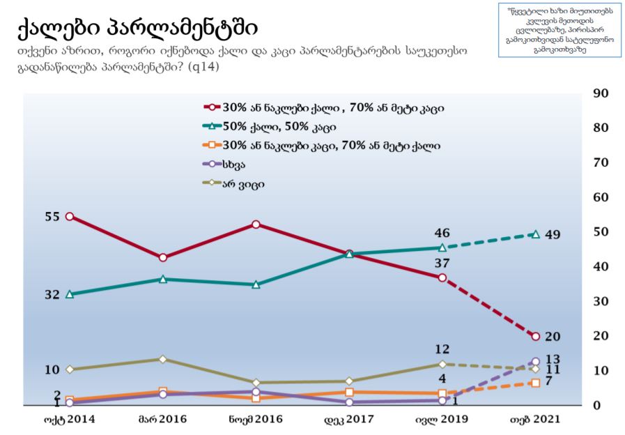 NDI-ის ახალი კვლევის მიხედვით, გამოკითხულთა 49% ფიქრობს, რომ პარლამენტში ქალის და კაცის საუკეთესო გადანაწიელბა 50% - 50%-ზე იქნებოდა. ამავე კითხვის პასუხად 16% მიიჩნევს, რომ 30% ან ნალები ქალი უნდა იყოს, 70% ან მეტი კი კაცი.