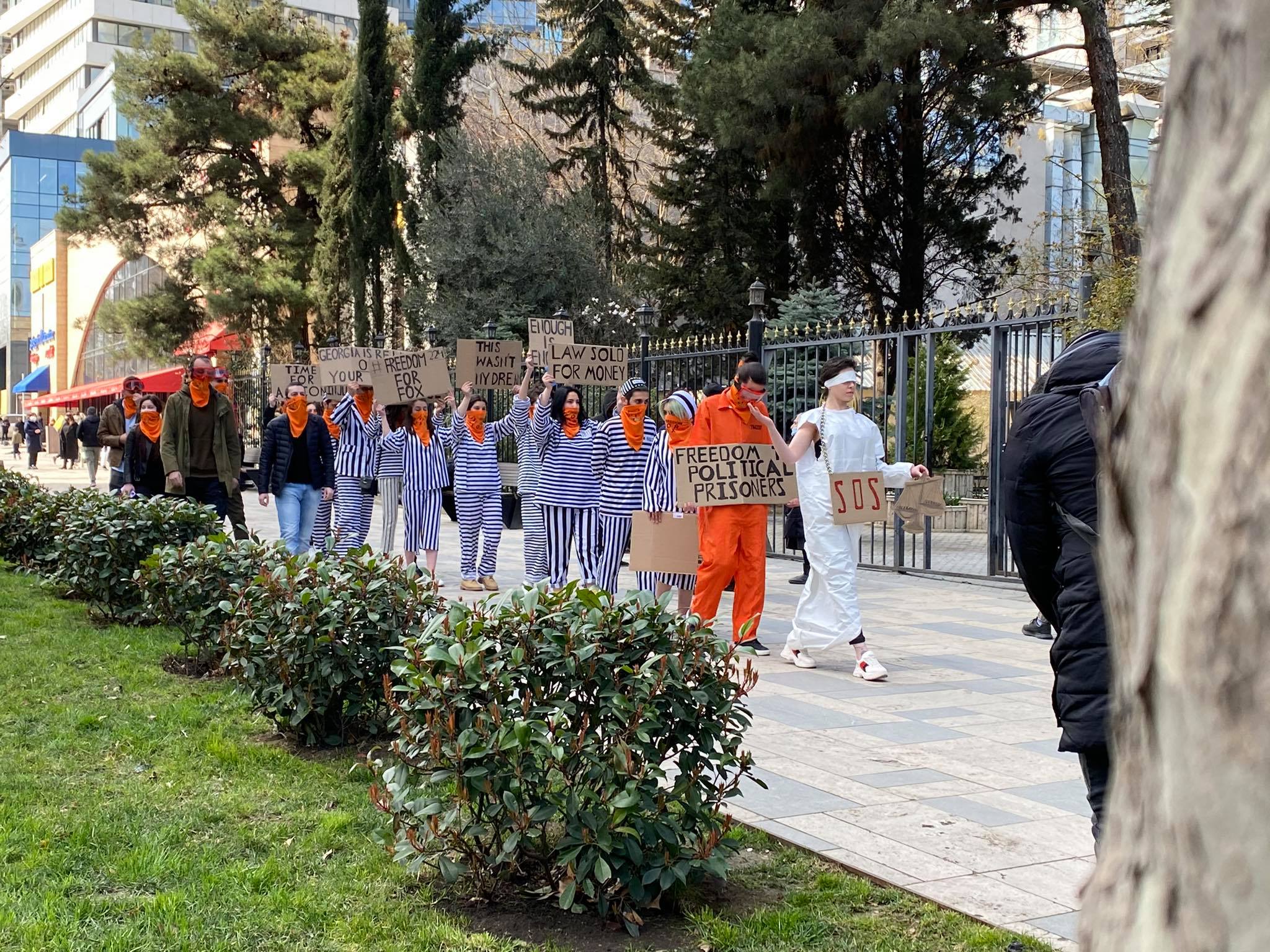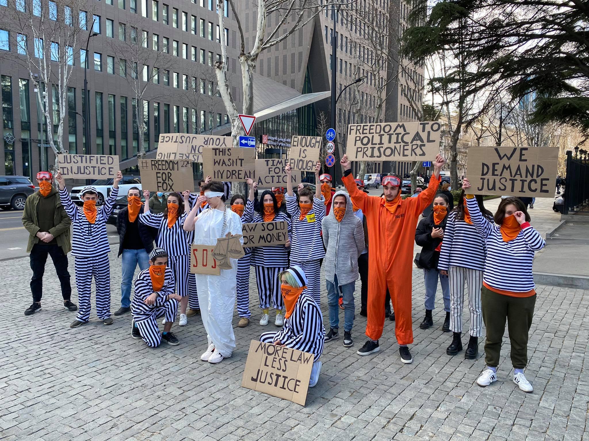 ევროკავშირის წარმომადგენლობის ოფისთან, კრისტიან დანიელსონისა და "ქართული ოცნების" წევრების შეხვედრის პარალელურად, თეატრალიზებული აქცია-პერფორმანსი გამართეს ენმ-ს ახალგაზრდულმა ფრთამ.