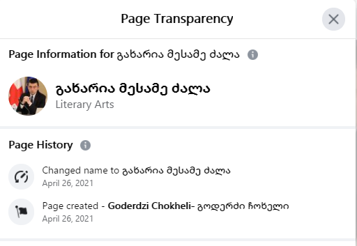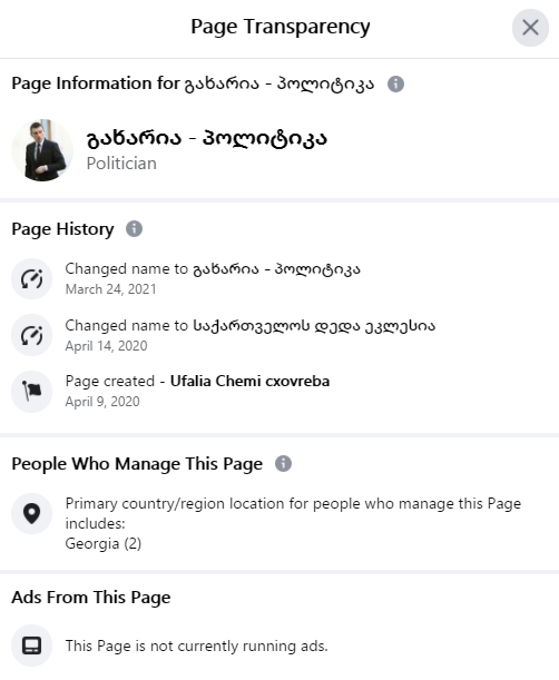 ასევე, 2020 წლის 9 აპრილს შექმნილი გვერდი სახელად "Ufalia Chemi cxovreba", რომელიც ჯერ "საქართველოს დედა ეკლესიად", 24 მარტს კი "გახარია - პოლიტიკა" გახდა.