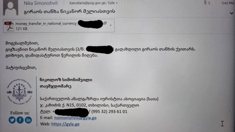 ევროკავშირმა სპეციალური ფონდის საშუალებით ნიკა მელიას გირაო - 40 ათასი ლარი გუშინ გადმორიცხა.