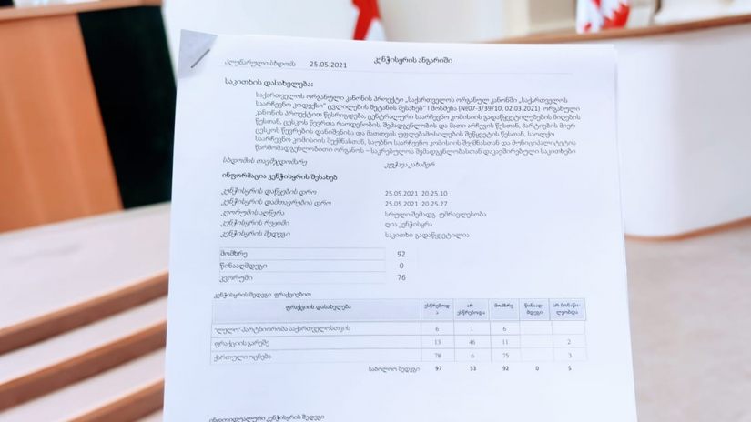 92 ხმით არცერთის წინააღმდეგ, პარლამენტმა "საარჩევნო კოდექსში" შესატანი ცვლილებების პროექტს მხარი პირველი მოსმენით დაუჭირა.