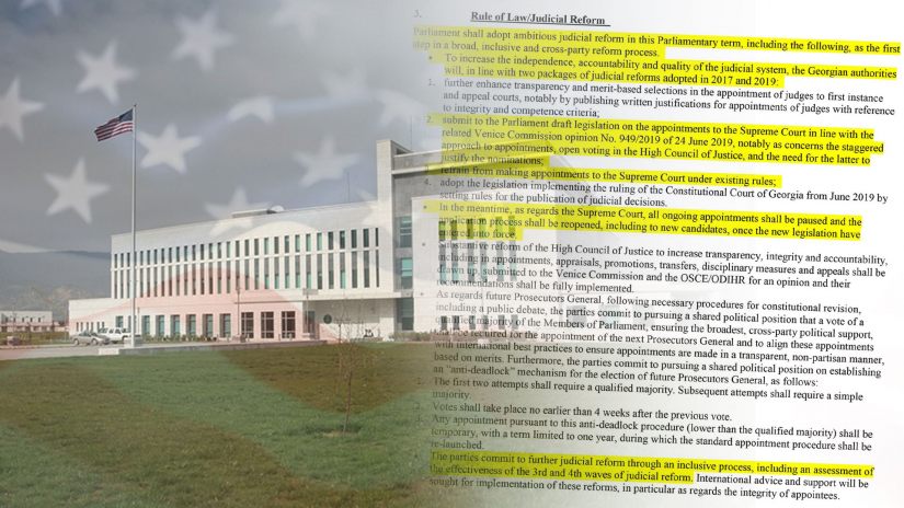 აშშ-ს საელჩო საქართველოში, მოსამართლეების დანიშვნის პროცესთან დაკავშირებით განცხადებას ავრცელებს და ხელისუფლებას შარლ მიშელის დოკუმენტს ახსენებს და მეტი თვალსაჩინოებისთვის ყვითლად აქვს მონიშნული შეთანხმების პუნქტები.