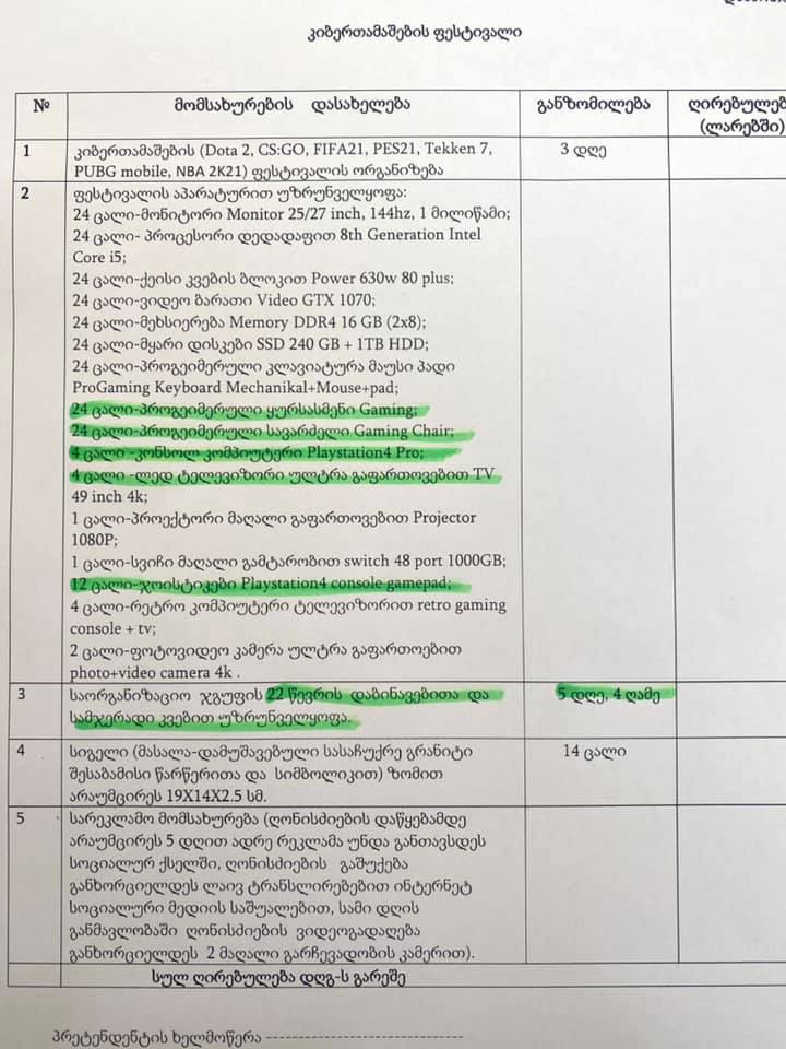 "ერთიანი ნაციონალური მოძრაობის" წევრის, ლევან ხაბეიშვილის ინფორმაციით, ფოთის მუნიციპალიტეტის მერიამ 4 ცალი "ფლეისთეიშენ პროს", 12 ცალი ჯოისტიკის, 24 ცალი ყურსასმენისა და 24 ცალი "პროგეიმერული" სავარძელისთვის 26 271 ლარი გამოყო.