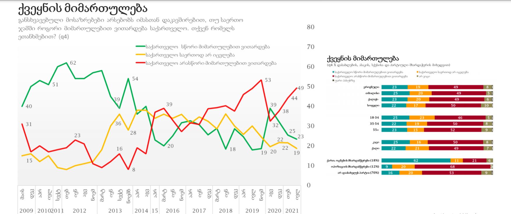 25% ამბობს, რომ სწორი მიმართულებით, 19% ფიქრობს, რომ საქართველო საერთოდ არ იცვლება, 8%-ს კი ამ კითხვაზე პასუხი არ აქვს.