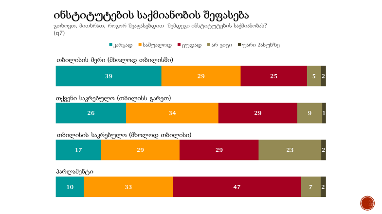 კითხვაზე, როგორ შეაფასებდით შემდეგი ინსტიტუტების საქმიანობას? პასუხები ასე გადანაწილდა: