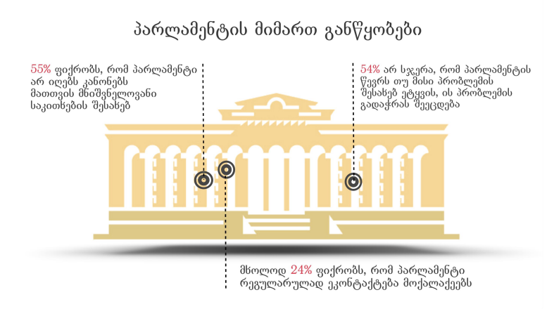 გარდა ამისა, გამოკითხულთა 55% ფიქრობს, რომ პარლამენტი არ იღებს კანონებს მათთვის მნიშვნელოვანი საკითხების შესახებ; 54%-ს კი არ სჯერა, რომ პარლამენტის წევრი მისი პრობლემის გადაჭრას შეეცდება.