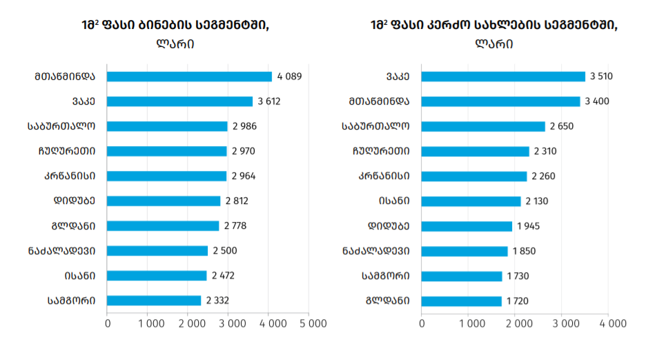 დედაქალაქის ყველაზე ძვირადღირებული უბნები მთაწმინდა, ვაკე და საბურთალოა, ყველაზე იაფი - ნაძალადევი, ისანი და სამგორი.