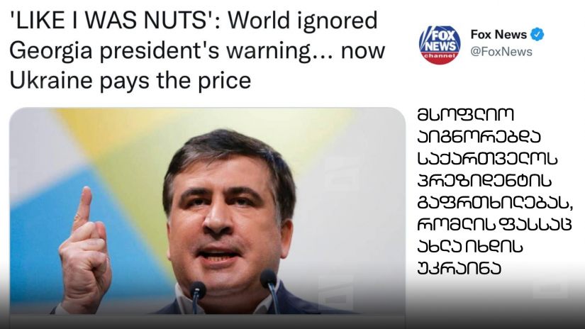 "მსოფლიო აიგნორებდა საქართველოს პრეზიდენტის გაფრთხილებას,რომლის ფასსაც ახლა იხდის უკრაინა" - ნათქვამია FOX news-ის სარედაქციო სტატიაში, რომელსაც გამოცემა უკრაინაში რუსეთის სამხედრო ინტერვენციის დაწყებასთან დაკავშირებით ავრცელებს.