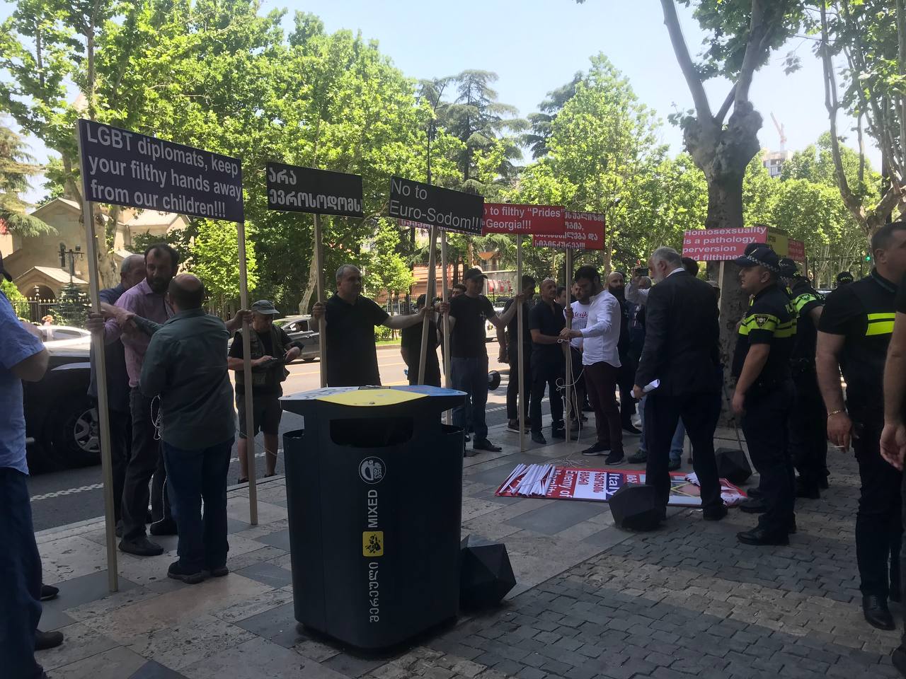 მათ ადგილზე მიტანილი აქვთ ბანერები წარწერებით "არაევროსოდომს", "ლგბტ დიპლომატებო შორს ბინძური ხელები ჩვენი შვილებისგან", "ყველა სამარცხვინო ლგბტ ელჩი გაძევდეს საქართველოდან".