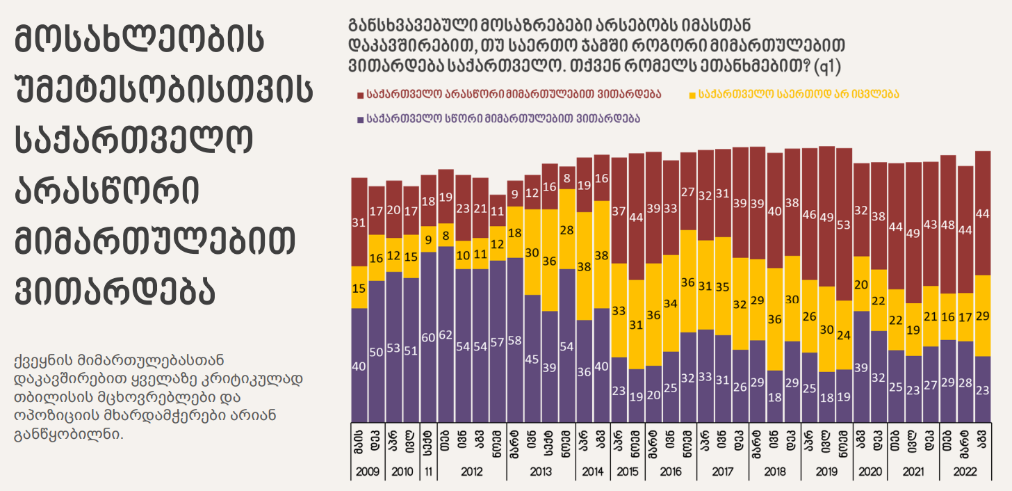 გამოკითხული მოსახლეობის 44% მიიჩნევს, რომ ქვეყანა არასწორი მიმართულებით ვითარდება; 23%-ის აზრით, სწორი მიმართულებით, ხოლო 29%-ის აზრით - საერთოდ არ იცვლება.